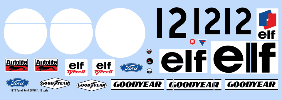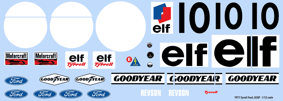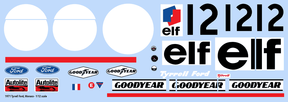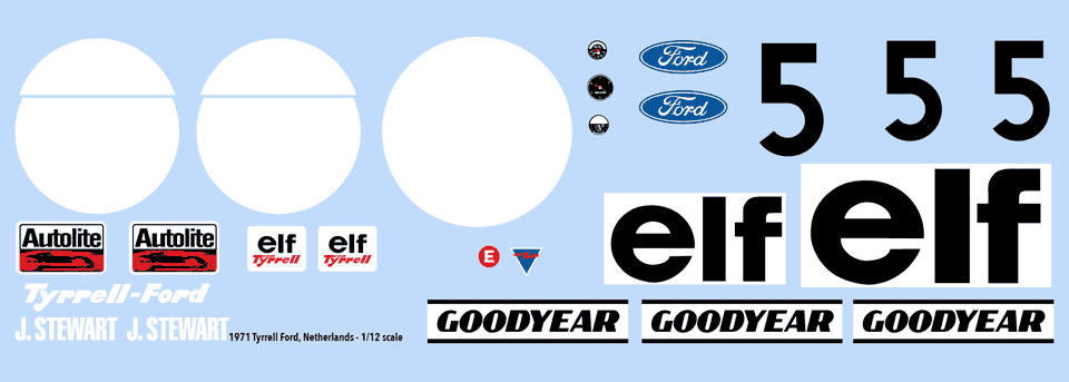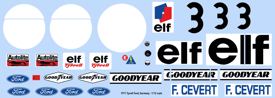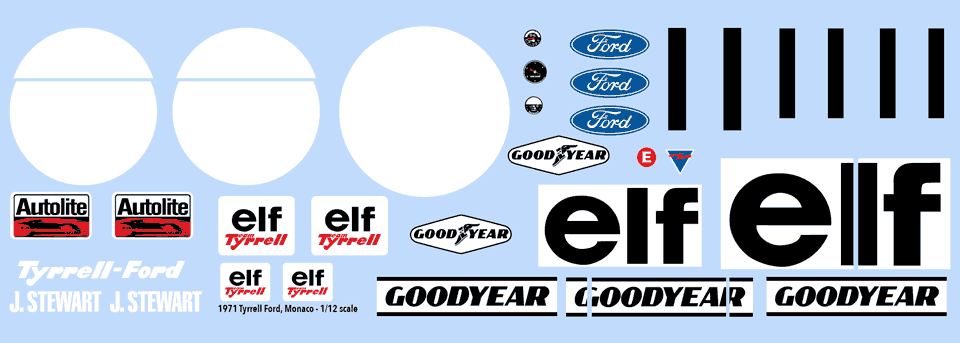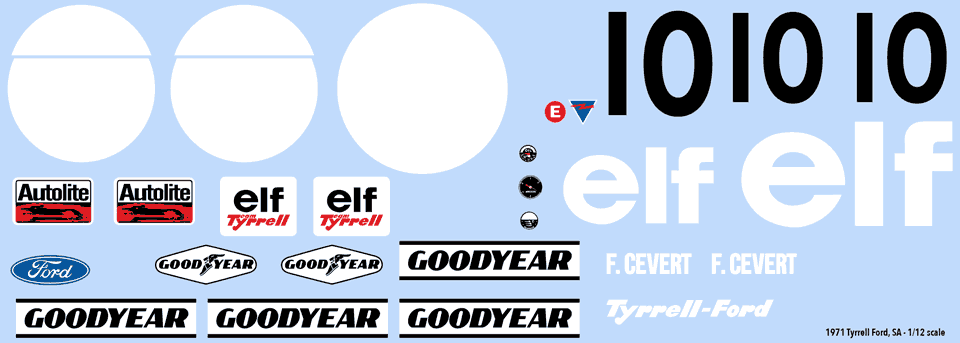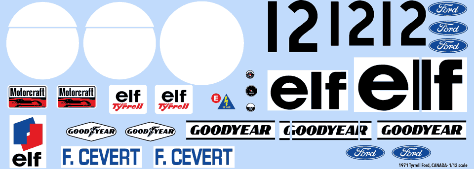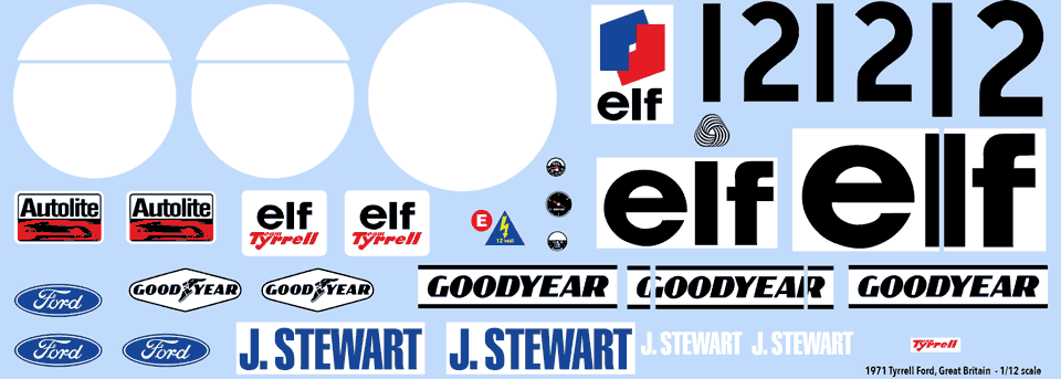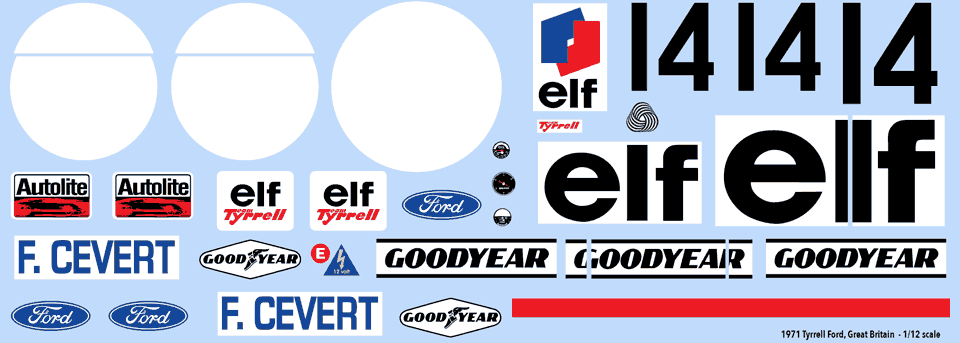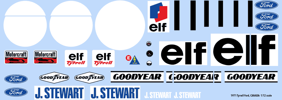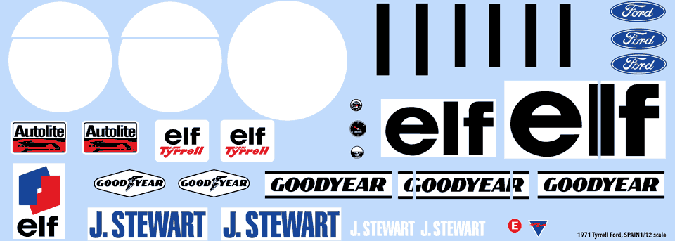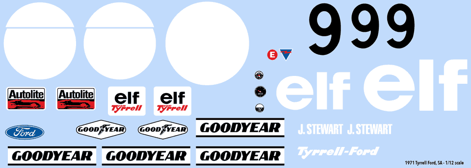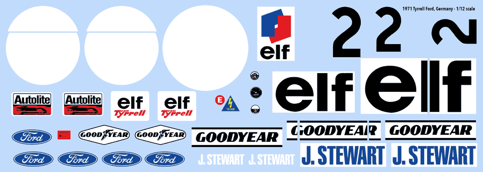 This sheet has been updated with options for EVERY race of the 1971 F1 season as driven by Jackie Stewart, Francois Cevert or Peter Revson (USGP only). Use the options below to select which driver and race you want.We have gone to great lengths to get the markings correct for each race (NOT an easy task). There were some changes during the year, particularly a switch from Autolite to Motocraft associate sponsorship, and different style 'kill switch' logos. We have made sure each race comes with the proper decals including race specific markings such as the"Circuit Paul Ricard" decal as used at the French GP or the Woolmark logo used in Great Britain. Also note, Jackie Stewart used an experimental rear wing in Italy that would require some scratch building if you attempt it.