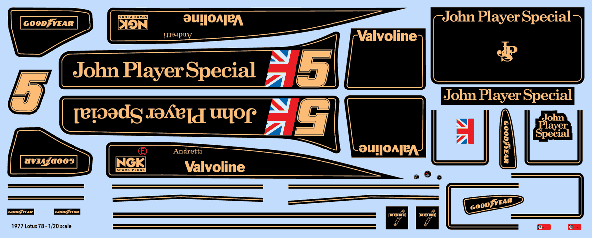 NOTE: This is for the 1977 version of the Lotus 78 and is designed to be used with the original front and rear wingplates that were molded in plastic. If you want to build the 1978 version with the photo etch wingplates, you need to order the 1978 version of the Lotus 78 decals.