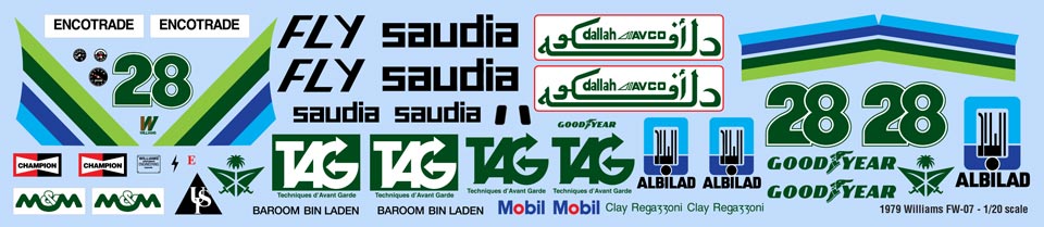 Designed around the 1/20 Tamiya kit, this sheet is available in a variety of scales. Please note the large green decals for the top of the side pods are not on this sheet. The green printing on this sheet is designed to match Tamiya TS43 Racing Green. Photo depicts the car that won the 1979 British Grand Prix at Silverstone. Specify Alan Jones #27 or Clay Regazzoni, #28.