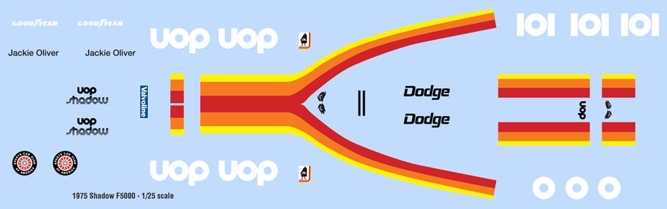 Designed for use with Kevin Kuzman's 1/25 scale Shadow F5000 kit. Available in a variety of scales. Photo of restored car, accuracy not guaranteed.