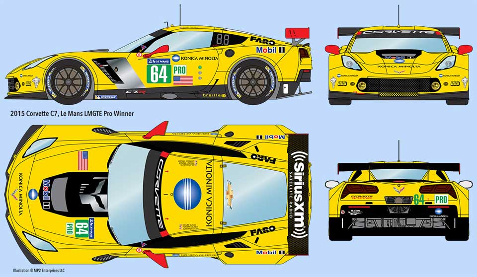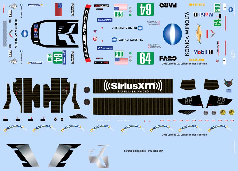 Designed for the Revell Corvette C7R 1/25 scale kit. 1/25 decals include carbon fiber markings for the engine air intakes - these markings are not included at smaller scales. Please note - the chrome foil markings are no longer included with these decals. We printed a large supply when we still had the capacity to do so and that capacity is down to low single digits which we are holding onto for any possible "OOPS Protection™" claims. We recommend using Molotow chrome shot through an airbrush for the chrome, or Bare Metal Foil. We have lowered the 1/25 price by $2.00 as a result of this.