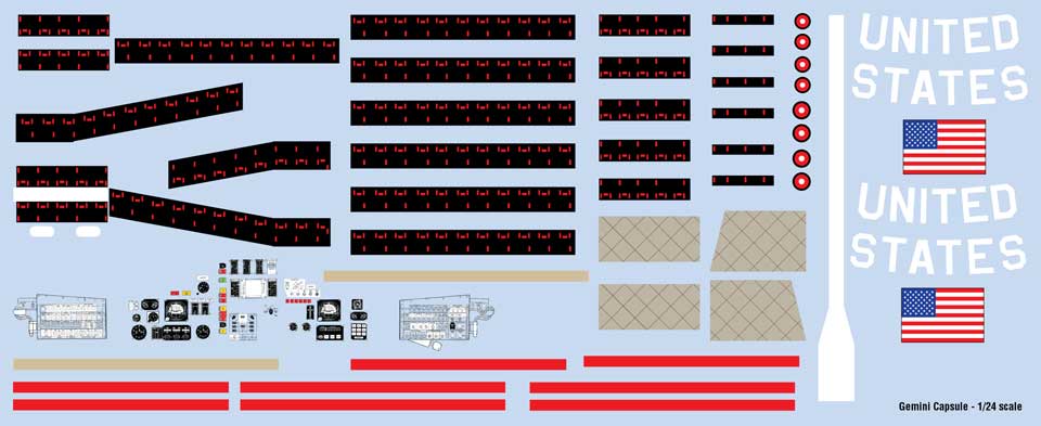 Designed for the Revell 1/24 scale Gemini capsule. Sheet includes instrument panels, door padding, door trim, and the red markings for the nose of the capsule. Available in a variety of scales. 1/48 scale and 1/72 scale decals are available with optional stripes for the service module (see pic below). Top picture is actual build of the Revell Gemini kit with Indycals decals. Please note: