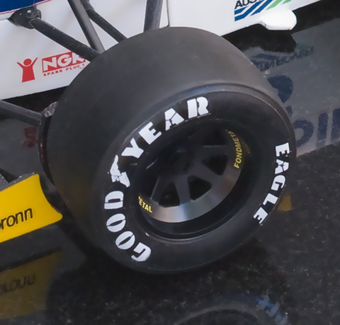 Stencil-style tire decals. 1/20 scale - 1 set per sheet; 1/18 scale - 2 sets per sheet; 1/12, scale, 1 set per sheet; 1/24 scale - 1 set per sheet; 1/32 scale - 1 set per sheet; 1/43 scale - 4 sets per sheet. Special 3-set pricing for 1/20 scale - use pull-down menu.