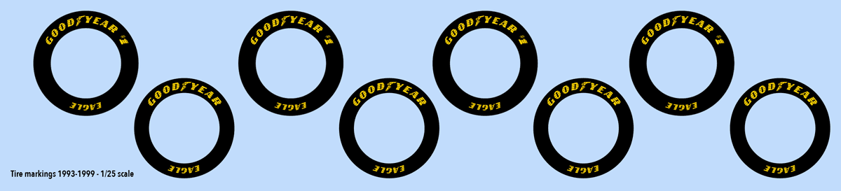 Tire decals for 1993 through 1999 Indy cars. One set of tires per sheet. Please note, these markings may not fit over raised lettering on tires. (These tires never actually had raised letters to begin with).