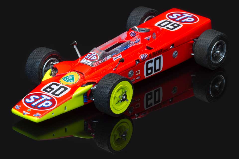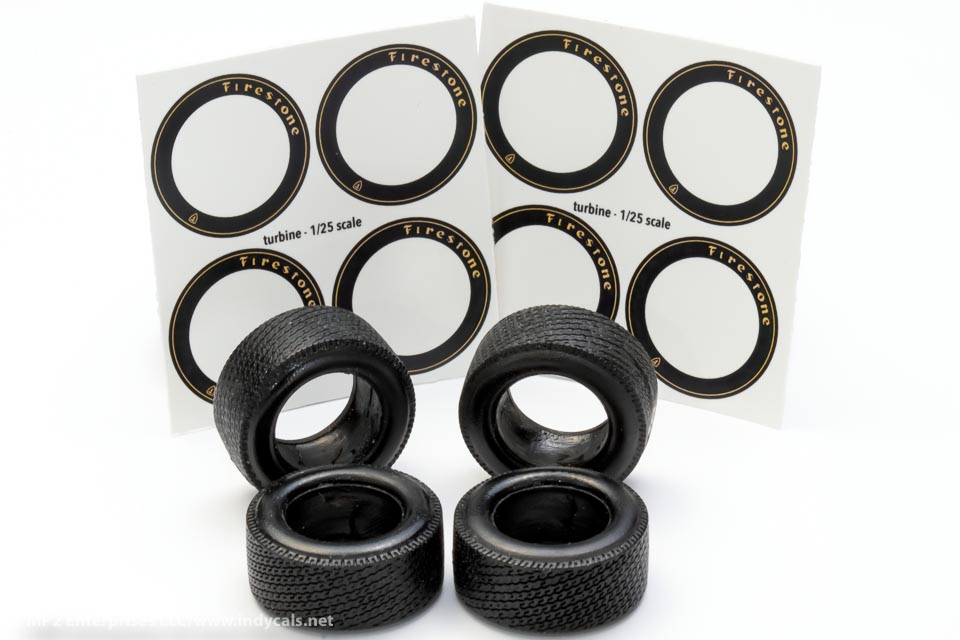 Accurate tires for the MPC 1968 Lotus Turbine kit, includes decals. Use wheels from kit to complete per the finished samples pictured above.